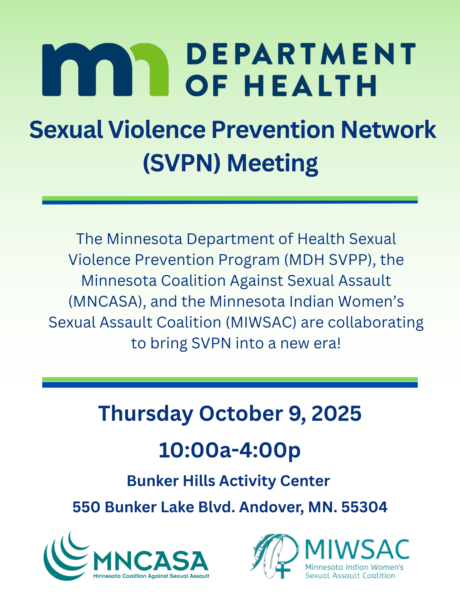 Date: Thursday, October 9, 2025 Time: 10:00a-4:00p. Registration begins at 9:30a. Venue: Bunker Hills Activity Center, 550 Bunker Lake Blvd NW, Andover, MN 55304 Cost: Free to attend!   Event We are excited to announce that the Sexual Violence Prevention Network (SVPN) Meetings are back! The Minnesota Department of Health Sexual Violence Prevention Program (MDH […]
